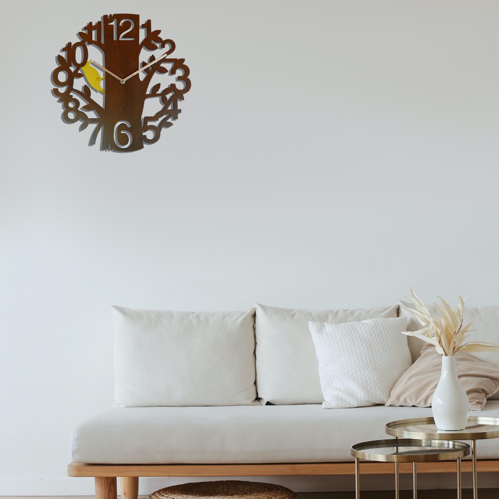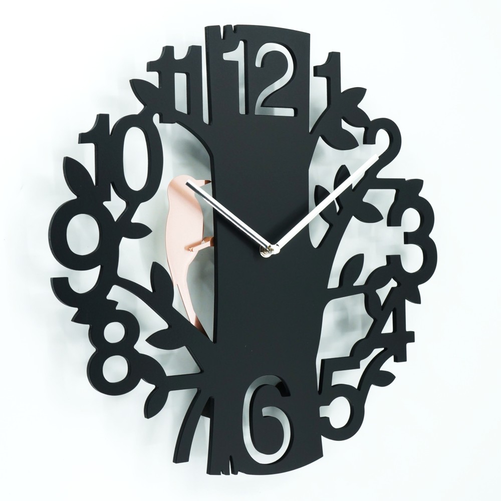 A creative wall clock inspired by a woodpecker, blending tree silhouette and numbers into a rhythmic natural design.