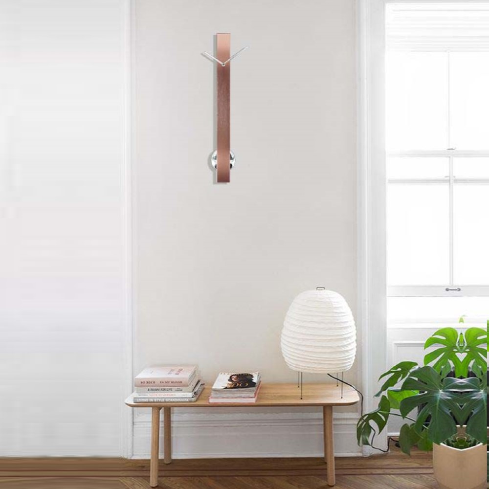 主體選用鋁合金方管霧面烤漆或玫瑰金電鍍髮絲紋處理,經過二十多道工序完成,線條俐落、質感沉穩,象徵時間如同柱體般堅定而延續。搭配簡約金屬指針,捨去冗餘刻度,保留最純粹的節奏感受。