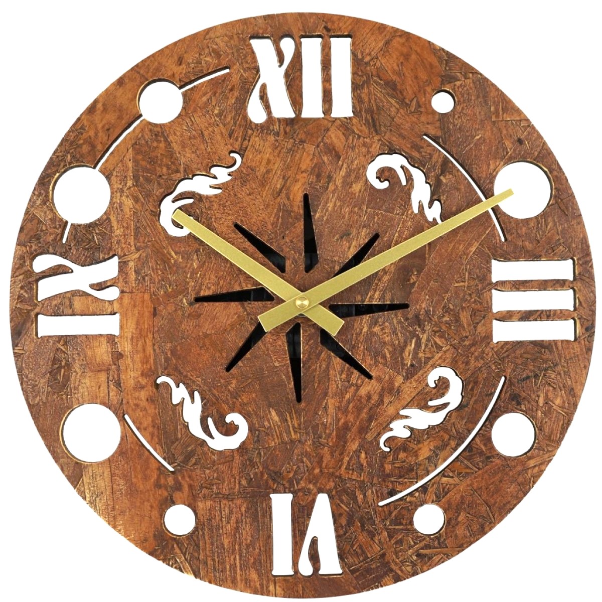 The Rustic Red Wooden Wall Clock features a round oriented strand board dial with natural wood texture and hollow-carved Roman numerals. Accented with golden hands, this clock combines functionality with rustic elegance, making it a perfect fit for living rooms, dining areas, or studies. Its warm countryside aesthetic adds a refined touch to any wall décor.